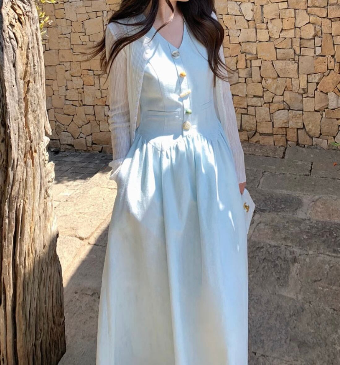 透明感のある酸素ミルクブルーに、シャネル風のクラシカルなデザインを組み合わせた、大人のためのノースリーブワンピース。