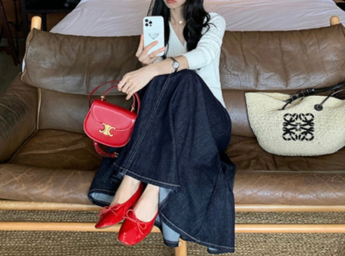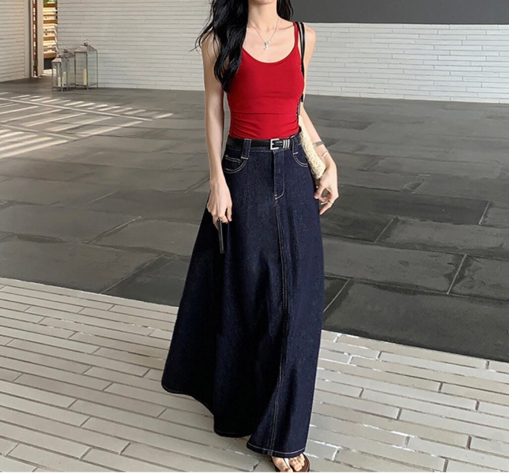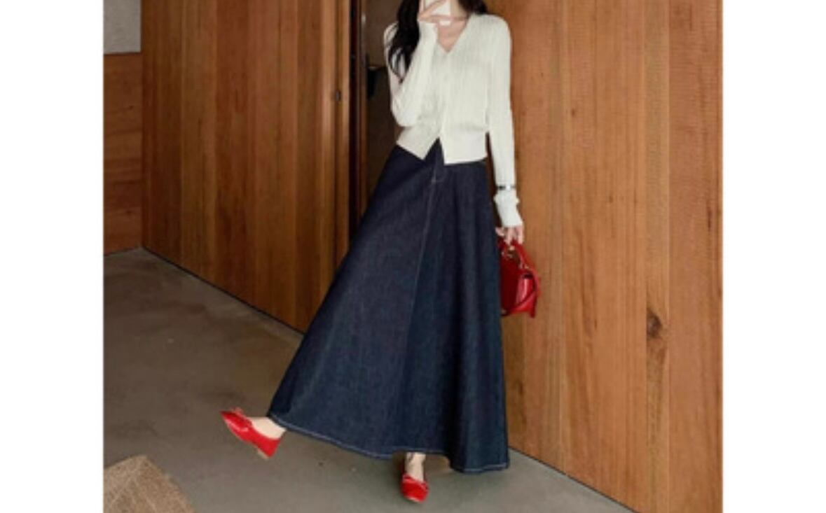 2025年の注目トレンド、「香港レトロ」スタイルを取り入れた大人のデニムロングスカート。